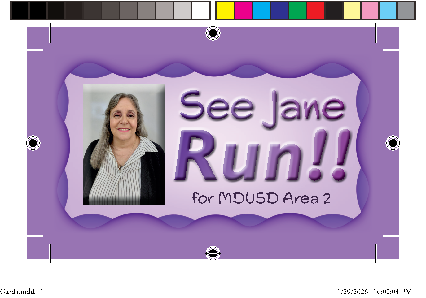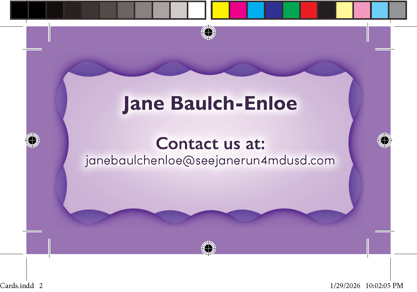 All of the images and information was given to me by Jane Enloe herself. The color scheme was also at the request of my client, who made it clear that she wanted a purple color scheme to represent herself. I made sure the card had a somewhat childish, yet organized, professional, and bold, just like I see her to be. In light of this, I used embossing effects on the front fonts and the picture of her to help make them stand out. The fonts I used are Swing King, Gill Sans Nova (Semi Bold, Bold & Bold Italic), and Sofia Pro (Regular), which were provided by Adobe Fonts. The assets for the slate were assembled in Adobe InDesign and exported with bleed and cut marks to be sent to the printer.